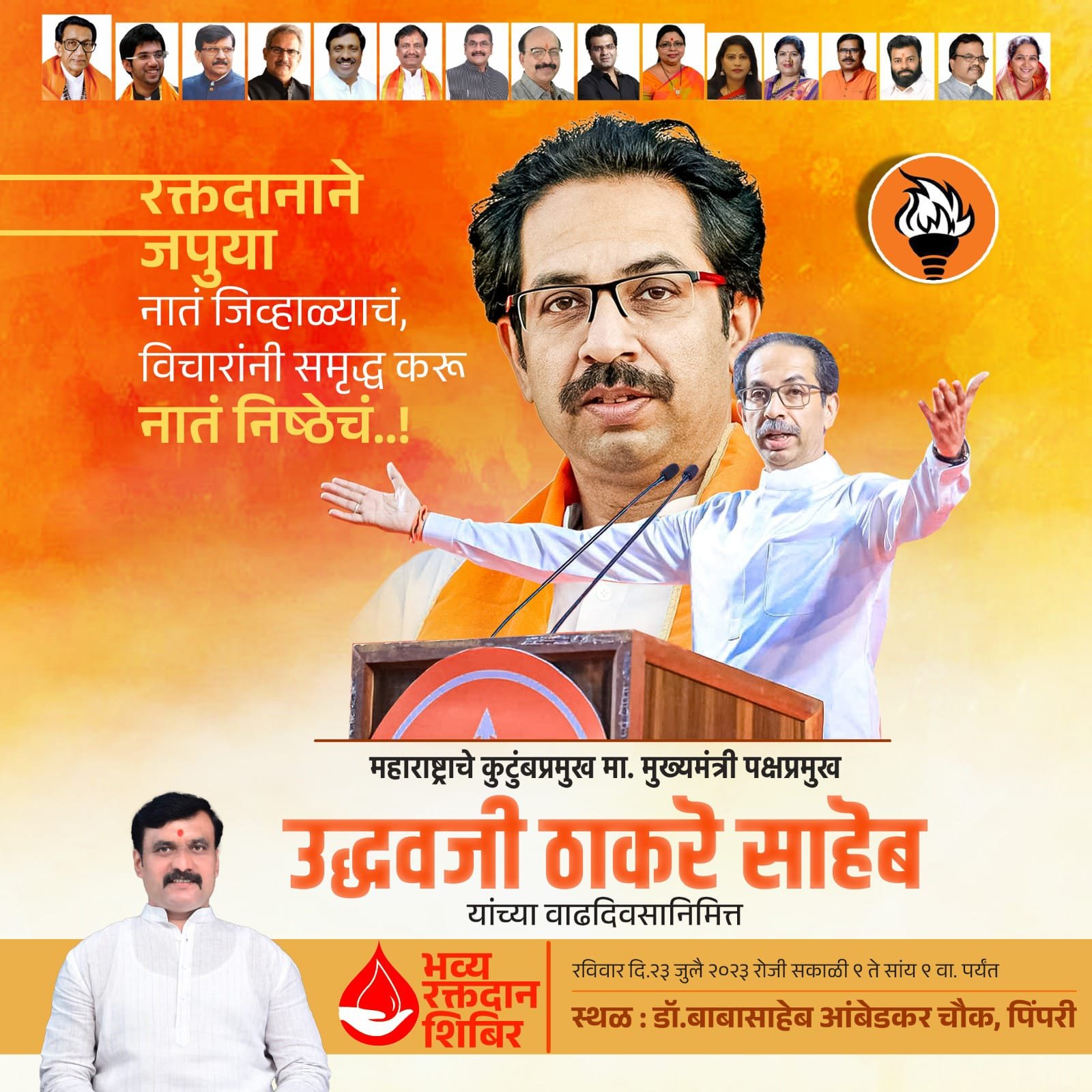 पिंपरी :- पक्षप्रमुख मा.श्री. उद्धव बाळासाहेब ठाकरे वाढदिवसानिमित्त भव्य रक्तदान शिबिराचे आयोजन रविवार दिनांक २३ जुलै २०२३रोजी सकाळी ९:०० ते सायंकाळी ९:०० वा. डॉ.बाबासाहेब आंबेडकर चौक पिंपरी या ठिकाणी आयोजित करण्यात आले आहे.