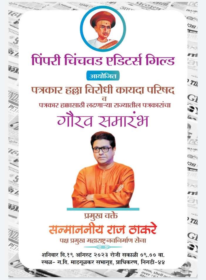 पिंपरी : पिंपरी चिंचवड एडिटर्स गिल्ड च्या वतीने पत्रकार हल्ला विरोधी व कायदा परिषद व पत्रकार हक्कासाठी लढणाऱ्या राज्यातील ज्येष्ठ पत्रकारांचा गौरव समारंभ आयोजित करण्यात आला आहे. शनिवारी (दि.19) सकाळी 9 वाजता निगडी प्राधिकरण येथील ग.दि. माडगूळकर सभागृहात या कार्यक्रमाचे आयोजन करण्यात आले आहे. यावेळी मनसे प्रमुख राज ठाकरे हे प्रमुख वक्ते असणार आहेत. यावेळी ‘पिंपरी चिंचवड एडिटर्स गिल्ड’कडून ‘महाराष्ट्र टाईम्स’चे संपादक पराग करंदीकर, ‘लोकशाही मराठी’चे संपादक कमलेश सुतार, ‘एबीपी माझा’चे राहुल कुलकर्णी, ज्येष्ठ पत्रकार अव्दैत मेहता, न्यूज 18 लोकमतचे गोविंद वाकडे यांच्यासह 12 ज्येष्ठ पत्रकारांना मनसे प्रमुख राज ठाकरे यांच्या हस्ते पुरस्कार दिला जाणार आहे.