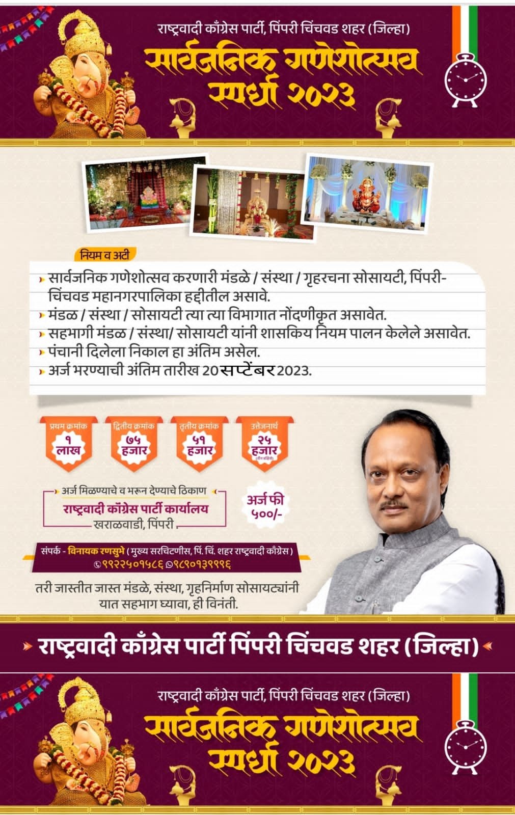 स्पर्धेसाठी अर्ज भरण्याची अंतिम तारीख 20 सप्टेंबर 2023 असेल. अर्ज मिळण्याचे व भरून देण्याचे ठिकाण राष्ट्रवादी कॉंग्रेस पार्टी कार्यालय, खराळवाडी, पिंपरी असून अर्जासाठी 500 रु. इतके शुल्क असेल. तरी जास्तीत जास्त मंडळे, संस्था, गृहनिर्माण सोसायटयांनी या सार्वजनिक गणेशोत्सव स्पर्धेत सहभाग घ्यावा, असे आवाहन शहर (जिल्हा) राष्ट्रवादी काँग्रेसतर्फे करण्यात आले आहे.